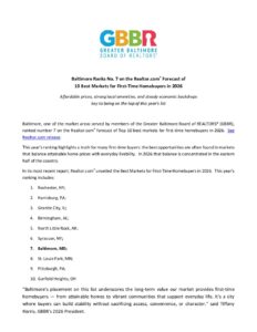GBBR Article – Baltimore ranks 7th for Realtor.com for First-time Homebuyers 2026